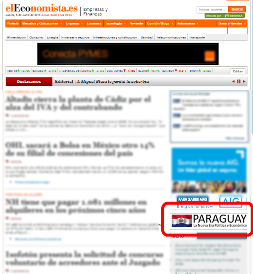 La publicación se realizó con el apoyo de la Embajada del Paraguay ante el Reino de España y se encuentra en la portada de la sección de “Empresas”, sale anunciada en la columna de la derecha de la página con el título: “Paraguay, La Nueva Era Política y Económica”.