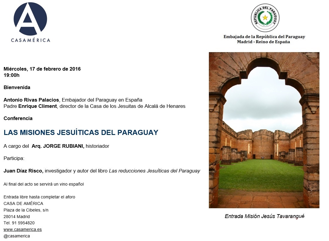 La Embajada del Paraguay en España, en coordinación con Casa América, llevará a cabo una conferencia bajo el título “LAS MISIONES JESUÍTICAS DEL PARAGUAY”, a cargo del Arq. JORGE RUBIANI, investigador e historiador paraguayo, el miércoles 17 de febrero del 2016, a las 19:00 horas, en la sede de Casa América.