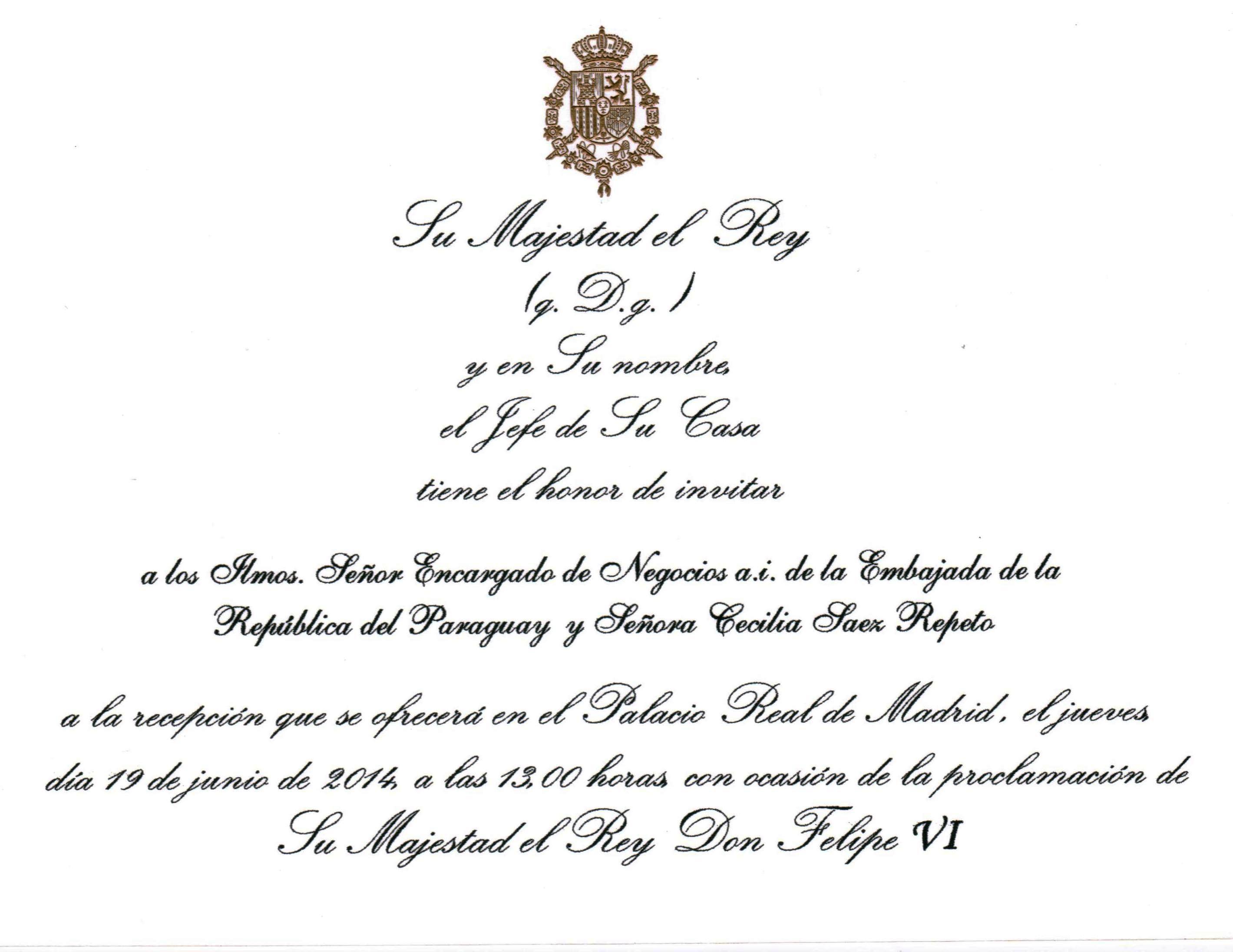 El Ministro Gustavo Gómez Comas, Encargado de Negocios a.i. de la Embajada de la República del Paraguay ante el Reino de España y su Señora Doña Cecilia Sáez Repetto, participarán en los Actos Oficiales con motivo de la proclamación de Su Majestad el Rey Don Felipe VI.