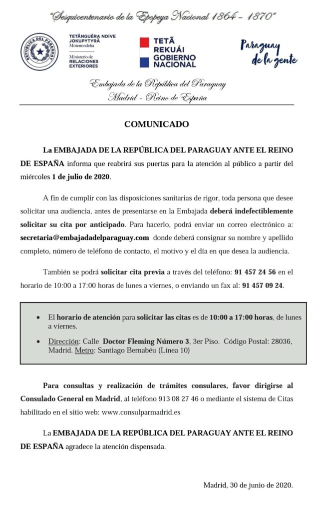 COMUNICADO OFICIAL – La Embajada del Paraguay ante el Reino de España reabrirá sus puertas para la atención al público a partir del miércoles 1 de julio de 2020.