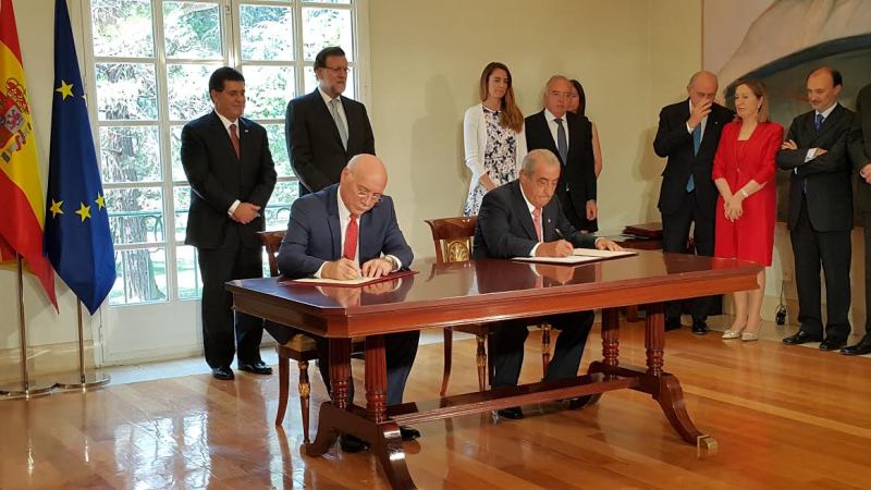 Cartes RajoyPosteriormente, en el Palacio de la Moncloa tuvo lugar el encuentro entre el Presidente del Gobierno español, Don Mariano Rajoy y el Presidente de la República del Paraguay, Don Horacio Cartes Jara, donde además de una reunión de trabajo sobre los temas de la agenda bilateral, con la participación de las comitivas oficiales de los dos países, se llevó a cabo la ceremonia de suscripción de los siguientes instrumentos bilaterales: